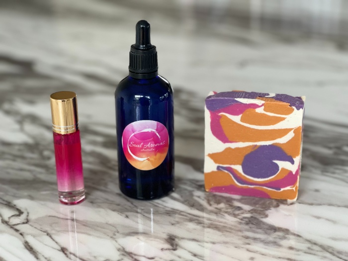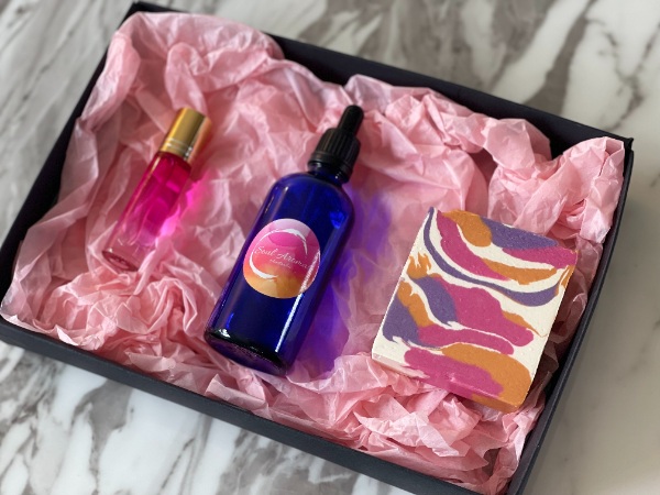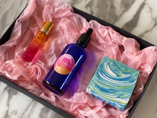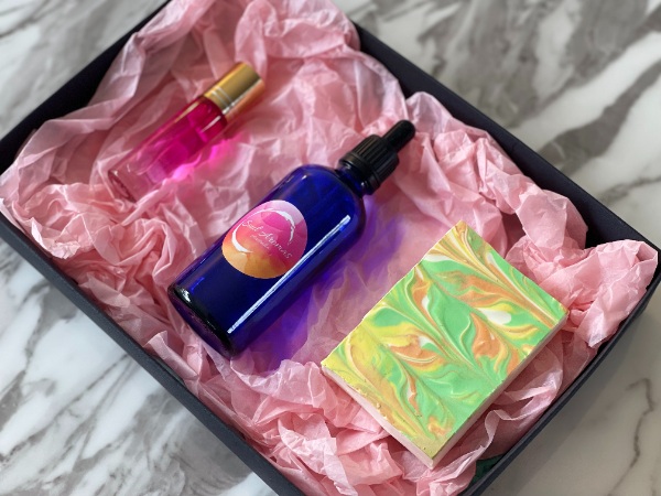This box contains: a 10ml body oil roller, 50ml/100ml body oil with dropper and a cold pressed soap.